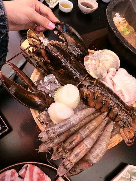 一大隻龍蝦,兩顆大干貝,五隻大蝦,新鮮魚片,兩顆巨大蛤蜊